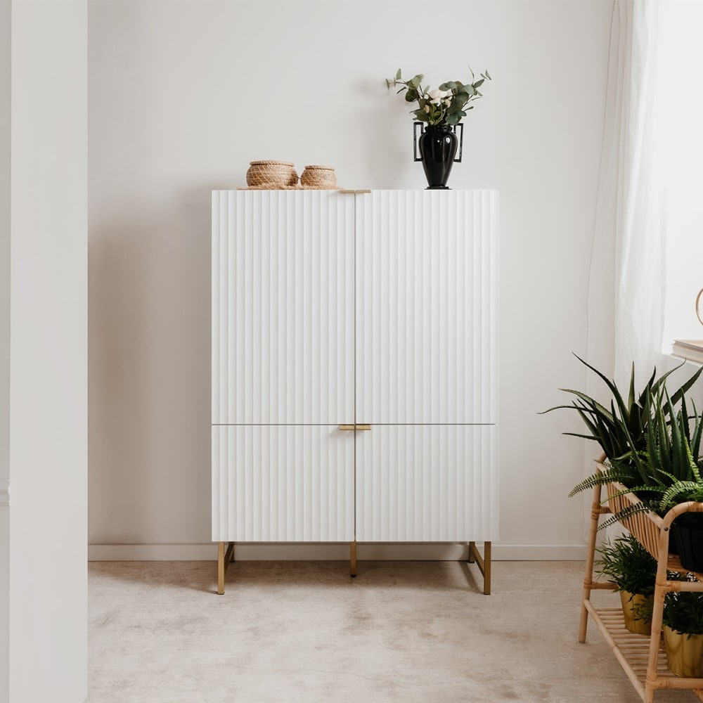 Produktmerkmale : 4 Türen. 2 Einlegeböden hinter den oberen Türen. 1 Einlegeboden hinter den unteren Türen. Farbe Weiß. Fronten mit vertikalem Struktureffekt. Hergestellt aus Spanplatten. Füße aus Metall. Hergestellt in Europa (Deutschland). Abmessungen des Produktes : Länge 100 cm x Breite 40,5 cm x Höhe 142 cm. Abmessungen der Pakete : Paket Nr. 1: Breite 130 cm x Länge 44 cm x Tiefe 9 cm – Bruttogewicht: 17,8 kg. Paket Nr. 2: Breite 90,5 cm x Länge 55 cm x Tiefe 10 cm – Bruttogewicht: 20,9 kg. Paket Nr. 3: Breite 109 cm x Länge 45 cm x Tiefe 26 cm – Bruttogewicht: 24,2 kg.