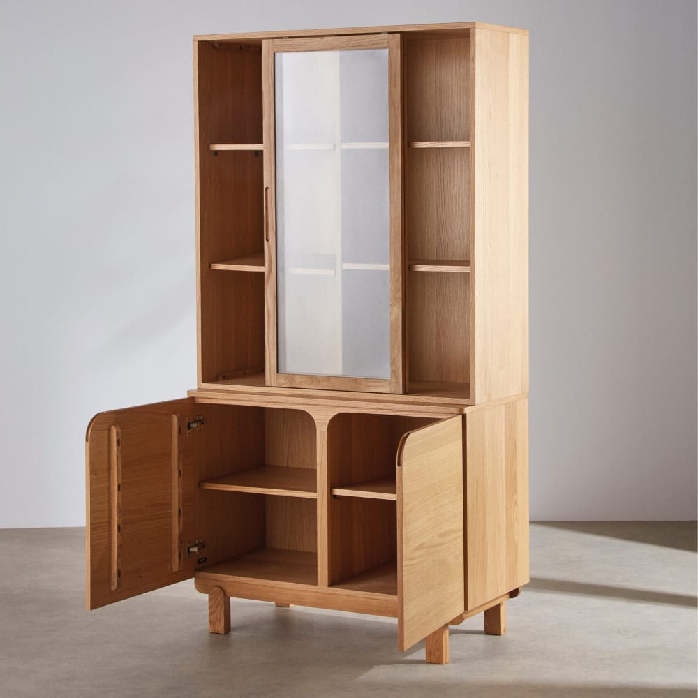 Erliegen Sie dem zeitlosen Charme des FREHA 2-türigen Schiebe-/2-türigen Dreh-Sideboards L100 – ein elegantes und funktionales Möbelstück für Ihr Zuhause. Seine klaren, modernen Linien, unterstrichen durch die Eichenholzoptik, verleihen Ihrem Ess- oder Wohnzimmer einen Hauch von Raffinesse und Ruhe. Hinter den beiden oberen Glastüren können Sie Ihr schönstes Geschirr oder Ihre Dekorationsobjekte stilvoll präsentieren und einen hellen, luftigen Blickfang schaffen. Mit seinen sechs herausnehmbaren Einlegeböden bietet dieses kompakte Sideboard optimalen Stauraum und passt sich all Ihren Bedürfnissen und Wünschen an.
