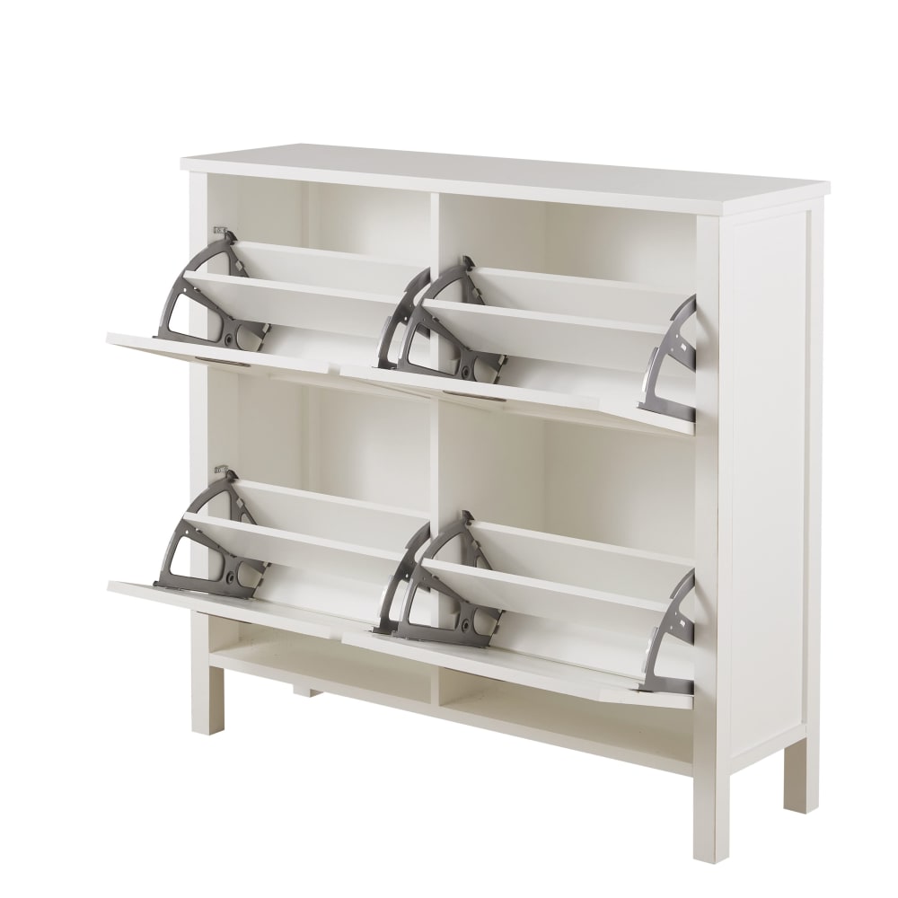 Der Schuhschrank mit 4 Türen, weiß SEASHORE ist ein praktisches und stilvolles Möbelstück, das in jeden Eingangsbereich passt.Der Schuhschrank bietet Platz für 12 bis 16 Paar Schuhe und ist mit vier Türen ausgestattet.Die Türen sind aus MDF hergestellt und mit einem weißen Lack überzogen.Der Schuhschrank hat ein modernes Design mit grauen Metallgriffen und einem Gestell aus massivem Kiefernholz.Dieses Produkt ist eine Kreation der Designer von Maisons du Monde.