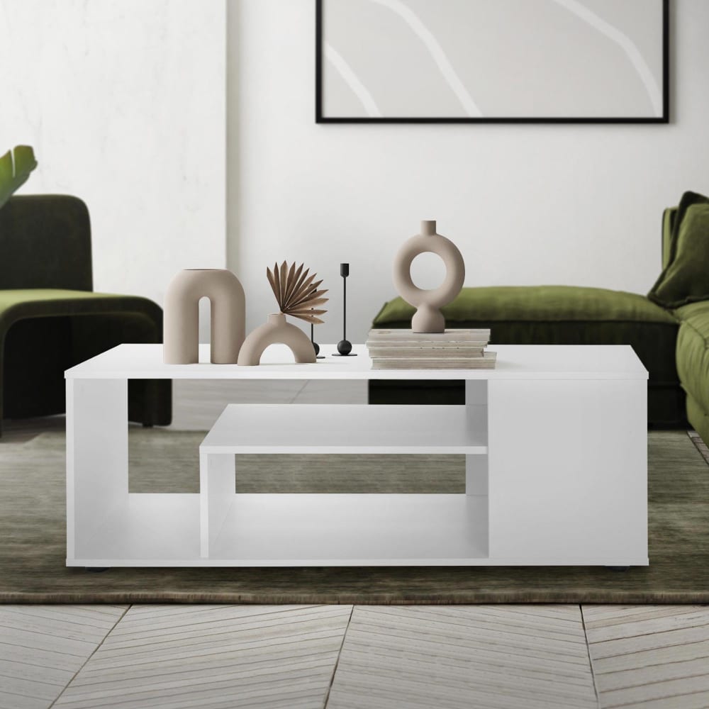 Dieser Couchtisch hat alles was du brauchst für einen preisgünstigen aber zugleich praktischen und funktionellen Wohnzimmertisch. Durch seine offene und moderne Bauform ist er nicht nur schön anzusehen, sondern auch äußerst reich an Abstellflächen. Auf insgesamt vier Abstellflächen kannst du deine schönste Deko, Zeitschriften, Magazine oder technische Geräte abstellen. Auf der 110 cm langen Tischplatte findet sich ausreichend Platz für die wichtigsten Dinge, die du im Wohnzimmer benötigst. Der weiße Couchtisch steht auf vier schwarzen Tischfüßen leicht erhöht.