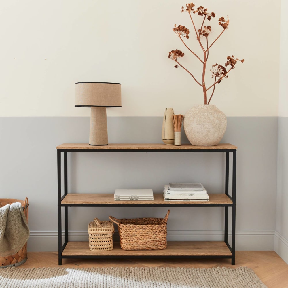 Produktvorteile HolzdekorDie Modernität des Metalls Loft-Design Die Kollektion LOFT hat einen ausgeprägten industriellen Stil. Die Möbel dieser Serie verbinden das Holzdesign mit dem modernen Charakter von Metall. Tisch und Bank, Regal, Bücherregal, Konsole… Unsere Möbelserie LOFT finden dank ihres schlichten Designs und ihrer zeitlosen Materialien ihren Platz in Ihrem Zuhause.Dieses Regal im Loft-Look kombiniert perfekt Metall und Holzdesign. Seine geraden und puren Linien werden Sie begeistern und zeichnen sich durch Eleganz und Zeitlosigkeit aus. Es passt perfekt in Ihr Wohnzimmer, Büro oder Schlafzimmer. Dieses Bücherregal macht sich gut in Ihrem Zuhause, da es auf seinen 3 Ebenen viel Stauraum bietet. Seine hochwertigen Materialien garantieren Stabilität und Langlebigkeit. Abmessungen des Produkts: L 120 x B 30 x H 80cmEinlegeböden: L 120 x B 30 cmStärke der Ablage: 1,5 cmHöhe zwischen den Ablagen: 33cm/32cmHöhe zwischen dem Boden und der 1. Ablage: 6cmRohrdurchmesser: Ø0,7mmAbmessungen der Beine: 2 x 2 cmHöhe der Beine: 80 cmGewicht : 16kgMax. Belastbarkeit: 45kg (15kg / Regal)