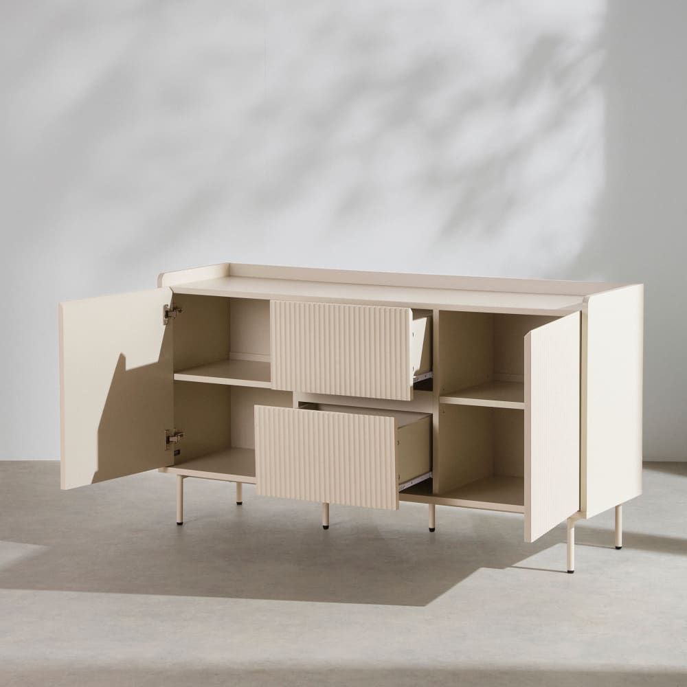 Entscheiden Sie sich für das 2-türige Sideboard mit 2 Schubladen in Ecru und Off-White, 140 cm breit – ein elegantes und funktionales Aufbewahrungsmöbel, das Ihrem Interieur einen Hauch von Modernität verleiht. Die zeitlose Ecru-Farbe und die klaren Linien passen perfekt zu jedem Einrichtungsstil. Mit seinen zwei Türen und zwei Schubladen bietet dieses Sideboard viel Stauraum für Geschirr, Besteck und andere Utensilien. Das Eisengestell mit matter Ecru-Oberfläche verleiht dem Möbelstück Eleganz und Leichtigkeit. Das FRAME Sideboard fügt sich perfekt in ein modernes oder skandinavisches Interieur ein.