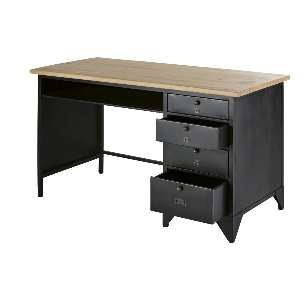 Lassen Sie mit dem Schreibtisch im Industriestil KANSAS mit 4 Schubladen aus grauem Metall und massivem Mangoholz ein Möbelstück mit Charakterstärke in Ihre Einrichtung. Er hat eine Platte aus massivem Mangoholz, auf der Sie bequem Ihrer Arbeit im Homeoffice nachgehen können, und das Gestell aus Metall sorgt für Stabilität. Für Ihr Büromaterial hält dieses Büromöbel 4 Schubladen bereit: genau richtig, um alles in Reichweite zu haben! Fehlt nur noch ein Ledersessel in Alt-Optik, und das urbane und trendige Flair ist perfekt.