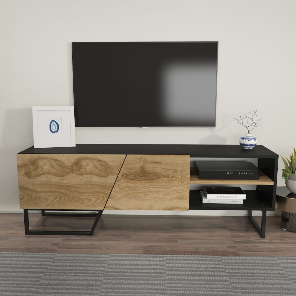 Das klar struktierte Design mit harmonische Farben und Metallbeinen schmeichelt jedem Wohnraum. Der Artikel zeichnet sich durch eine kombination aus geschlossenen und offenen Bereich aus. Der TV Board verschafft İhnen Platz und Stauraum für İhre Media Geräte, Bücher, Schallplatten, Accessoire und die gesclossenen mit Klapptüren sind für İhre persöhnliche sachen sehr geeignet. Für eine schnelle und fehlerfreie Installation sind die Produktteile mit Aufklebern entsprechend der Montageanleitung nummeriert Produktdetails: -Höhe: 50,5 cm | Länge: 150 cm | Breite : 35 cm | Gewicht: 27 Kg – 18 mm A Klasse Spanplatte – FSC®- zertifizierter – 0,4 mm PVC Saitenband – Metallbeine – Melaminbeschichtet – 2 Farbvariante – 2 geschossene Schränke mit Klapptüren – 3 Fächer – Umweltfreundliches material – Herkunft aus Türkei – Pflege mit einem feuchten Tuch oder Ledertuch