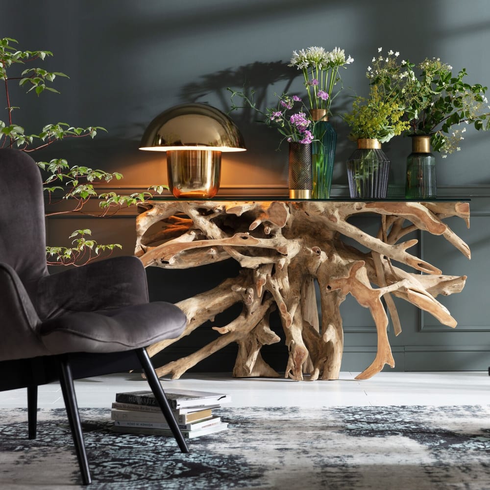 Die Konsole Roots verbindet natürlichen Charme mit moderner Eleganz. Das wurzelförmige Holzgestell aus naturbelassenem Teak-Holz trägt eine 1 cm dicke Glasplatte: Eine einzigartige Kombi, die in jedem Raum sofort für eine extravagante Note und einen echten Wow-Effekt in Ihrem Zuhause sorgt. Ein Interior Highlight, das die Herzen aller Exzentriker höher schlagen lässt!