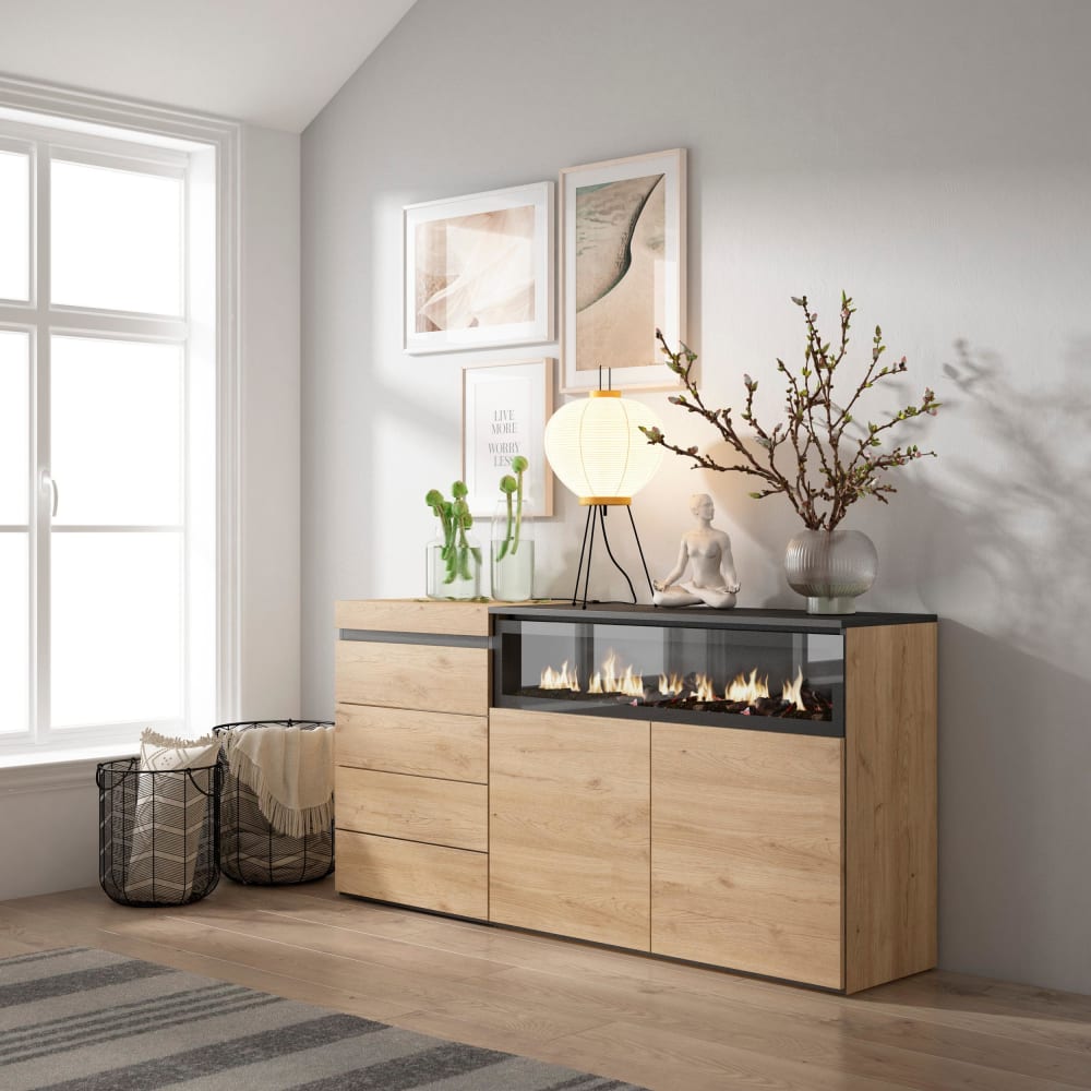 Elektrischer LED-Kamin. Maße: 102 cm breit, 21 cm hoch. Unglaublich realistischer 3D-Feuereffekt. Kein Verbrennungsrisiko, da keine Wärmequelle vorhanden ist. Leistung: 34 W. Inklusive Fernbedienung und 3 Intensitätsstufen.