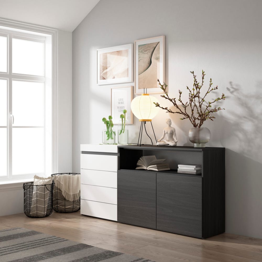 Kommode bestehend aus 4 Schubladen. Große Speicherkapazität. Elegant und praktisch, mit Drucköffnung. Moderner Stil. Abmessungen: 56,7 x 33 x 75 cm (breite x tiefe x höhe). Weiße und schwarz farbe mit hochwertiger poröser Touch-Holzmaserung.