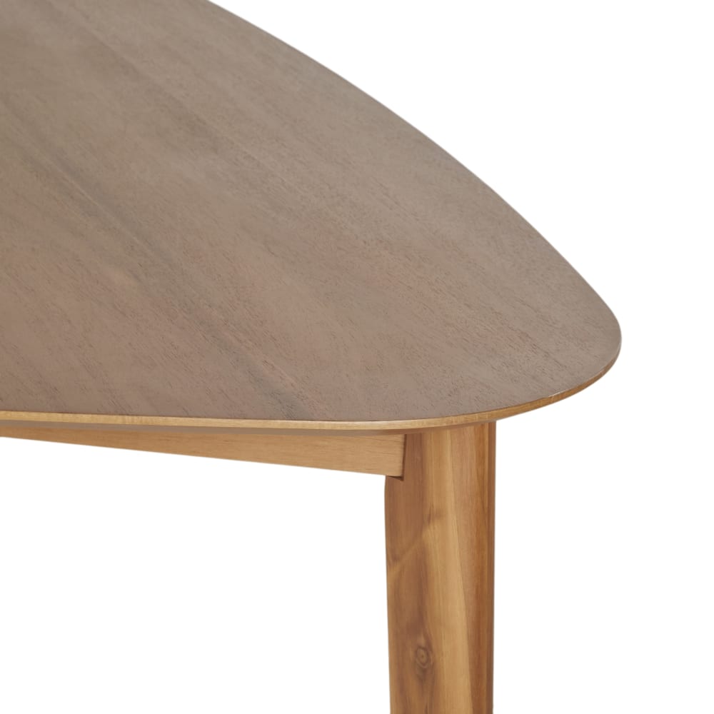 Der dreieckige Esstisch TARIFA aus Akazienholz ist ein echter Blickfang in Ihrem Esszimmer.Die Tischplatte aus Akazienholz ist mit einem transparenten Acryllack versehen, der die natürliche Maserung des Holzes hervorhebt.Das Gestell aus massivem Akazienholz sorgt für Stabilität und Langlebigkeit.Der Tisch bietet Platz für bis zu 6 Personen.