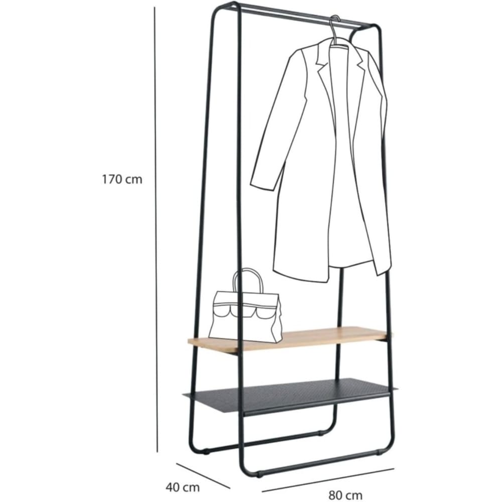 Dieser Kleiderständer vereint die Robustheit von Metall mit der Weichheit von Holz und ist mit seinem schlichten Design die ideale Lösung, um Ihre Kleidung elegant zu organisieren. Die schlanke, minimalistische Struktur passt perfekt in ein Schlafzimmer, einen Flur oder einen begehbaren Kleiderschrank und verleiht Ihrer Einrichtung einen modernen Touch. An der oberen Stange können Sie Mäntel, Hemden oder Jacken aufhängen, während die beiden unteren Ablagen praktischen Platz für Schuhe, Taschen oder Aufbewahrungsboxen bieten. Dieser stabile und robuste Garderobenständer wurde für eine lange Lebensdauer konzipiert und hält dem täglichen Gebrauch stand, ohne nachzulassen. Er ist mehr als nur ein Accessoire, er ist ein echtes Beistellmöbel, das Ästhetik und Zweckmäßigkeit vereint. Der Kontrast zwischen dem schwarzen Metall und dem hellen Holz verleiht ihm eine einzigartige Note, die gleichzeitig modern und warm ist. Dieser kompakte, diskrete und funktionelle Kleiderständer aus Holz wird schnell zu einem unverzichtbaren Begleiter, um Ihre Sachen immer griffbereit und perfekt organisiert aufzubewahren.