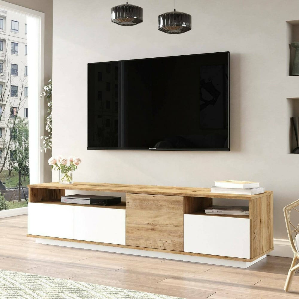 FERNSEHSCHRANK – Ständer für Wohnzimmerfernseher, Niedriges Wohnzimmer-Sideboard, TV-Ständerbasis, 180x45h45 cm, Eiche und Weiß. STRUKTUR UND VERWENDUNG – Moderner, innovativer und funktionaler Fernsehständer – Die Wahl der Innenstruktur, aus der dieses Wohnzimmerset besteht, macht das Design des Einrichtungsgegenstandes modern, vielseitig, praktisch und platzsparend – Das obere Regal ist perfekt für die Unterbringung Ihrer Fernseher, Stereoanlage oder Ihre Lieblingsdekorationen – Multifunktionsmöbel, perfekt für die Einrichtung von Umgebungen mit Platzbedarf. QUALITÄT UND DESIGN – Modernes und elegantes Design-Möbelstück, perfekt für die Einrichtung einer zeitgemäßen und hellen Umgebung – Ideal für alle, die nach Funktionalität und platzsparenden Lösungen suchen, ist dieses Produkt perfekt für Häuser und Wohnungen aller Größen – Zwei Jahre Garantie ab Kaufdatum – Montiert. TECHNISCHE EIGENSCHAFTEN – Vielseitiges Einrichtungszubehör, konzipiert für die einfache Integration mit anderen Möbeln – Widerstandsfähige Verpackung, konzipiert für den E-Commerce – Material: Melaminbeschichtete Platte 18mm – Zusätzliche Infos: Standardmäßiges Öffnen und Schließen – Nicht als Raumtrenner geeignet. ABMESSUNGEN IN CM – Fernsehschrank : Länge: 180 Breite: 44,5 Höhe: 44,6