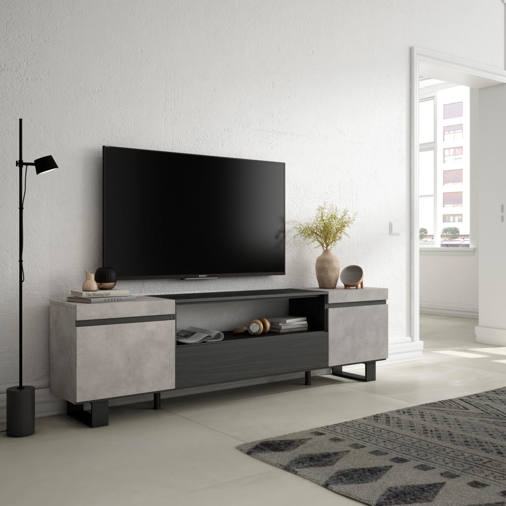 TV-Modul mit Tür, große Speicherkapazität. Abmessungen des Moduls: 51cm. breit, 45cm. hoch, 35cm. tief. Betongrau und Schwarz farbe mit hochwertiger poröser Touch-Holzmaserung.
