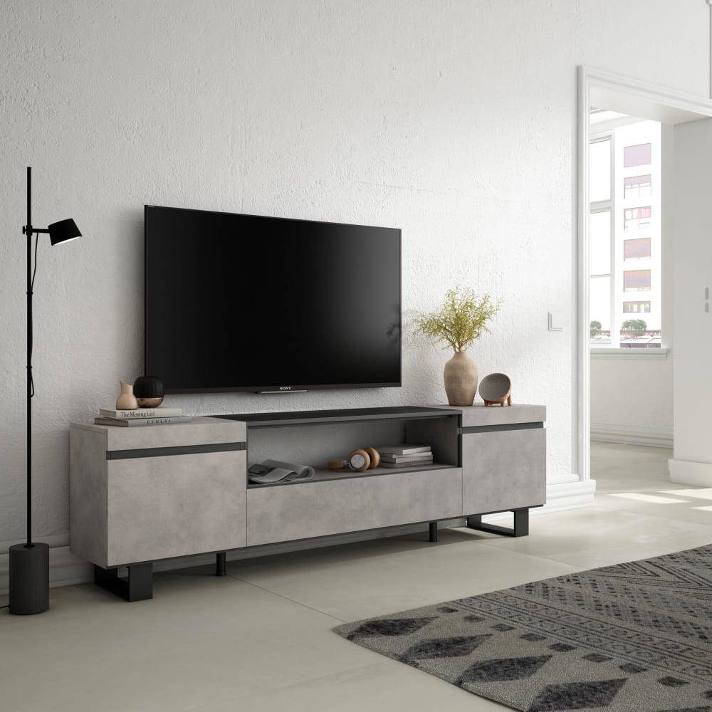 TV-Modul mit Fach zur Aufbewahrung Ihrer elektronischen Geräte und Klapptür. Maße des Moduls: 102 cm breit, 45 cm hoch, 35 cm tief. Farbe: Zement und Schwarz mit Holzmaserung, poröses Material von hoher Qualität.