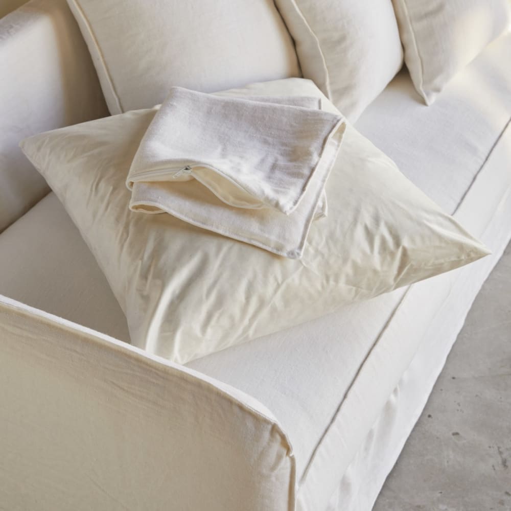 Das in Frankreich hergestellte 5-Sitzer-Sofa Ariane aus weißem Leinen vereint Komfort und schlichtes Design. Die Struktur aus Buchenholz ist robust und besonders langlebig, wobei das weiche und leichte Leinen Ihren Raum aufhellt. Mit seiner weichen Sitzfläche ist dieses Stück ideal zum Entspannen. Der abziehbare und waschbare Bezug erleichtert die tägliche Pflege.Sitzfläche: H. 43 x B. 193 x T. 82 cmRückenlehne: H. 44 cmArmlehnen: H. 21 cmStückweise mit 7 Kissen verkauftPolsterung Hauptmaterial: 100 % PolyurethanDichte: Rückenlehne: 20 kg/m3 Sitzfläche: 22 kg/m3Flammschutzbehandlung: neinZusammensetzung Stoffbezug: 100 % LeinenProduktdetails:Hauptmaterial: Leinen Maße: H. 87 x B. 205 x T. 90 cmGewicht: 80 kg