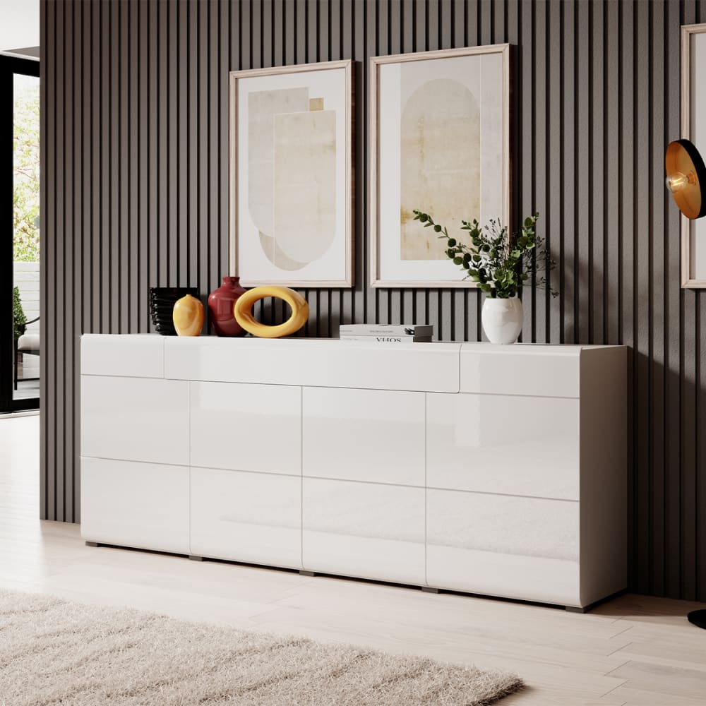 Sideboard 4 Türen 1 Schublade Jules BlancEuropäische Herstellung Kollektion :: Jules Farbe : Weiß lackiert Materialien : Laminierte SpanplattenFSC-zertifiziertes Holz aus nachhaltiger Forstwirtschaft Eigenschaften: 4 Türen6 Einlegeböden, davon 4 herausnehmbar2 Schubladen1 FrontMittlere Türen mit “Push to open“-Öffnung Gewicht und Maße: 84 kg208 x 39 x 82 cm Produkt geliefert, zum Zusammenbauen, Anleitung enthalten Produkt mit 24 Monaten Garantie Sicherheitsanweisungen: Möbel korrekt montieren – Empfohlene maximale Belastung laut Anleitung einhalten – Möbel fest an der Wand befestigen Gesamtanzahl der Kartons : 2 Gesetzlicher Vertreter: NAPKINS, 30-34 avenue Henri Matisse, 06200 Nizza, FRANKREICH
