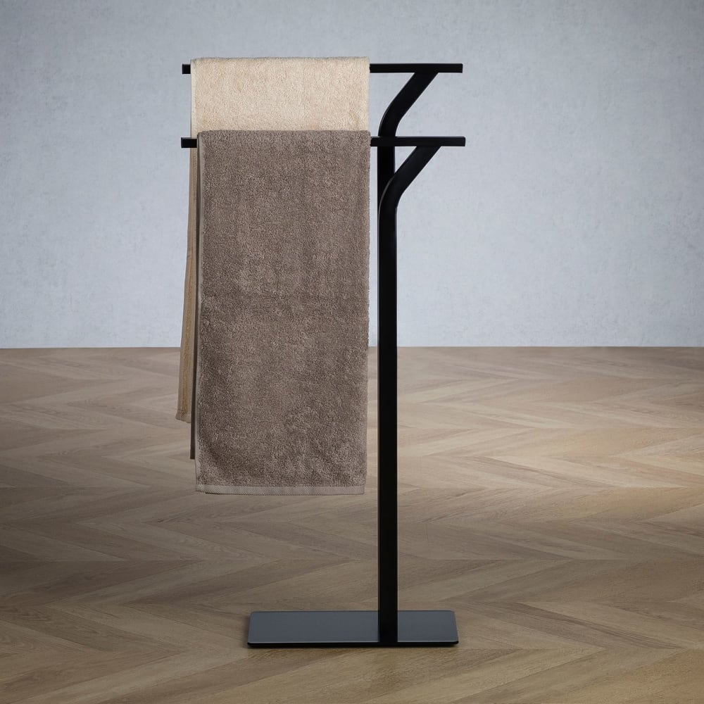 Der LEVIO Handtuchhalter bietet eine platzsparende Lösung für Ihr Badezimmer. Mit seinen zwei höhenversetzten Stangen ist er ideal, um Handtücher im Gäste- oder Hauptbad griffbereit zu halten. Das moderne Design in Schwarz fügt sich stilvoll in jedes Bad ein. Als freistehendes Badaccessoire benötigt er kein Bohren und ist schnell einsatzbereit.