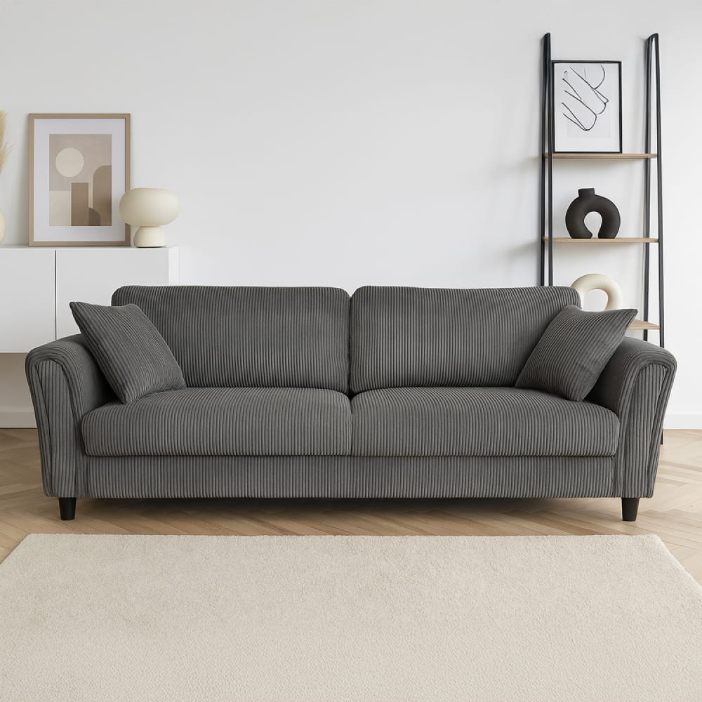 4-Sitzer-Sofa aus grauem Cord-VeloursBringen Sie mit diesem Cord-Velours-Sofa in Grün, Dunkelgrau oder Terrakotta einen Hauch von Charakter in Ihr Zuhause. Sein strukturiertes, weiches und warmes Material schafft eine gemütliche Atmosphäre und unterstreicht gleichzeitig einen zeitgenössischen Stil. Seine großzügige Silhouette mit abgerundeten Linien bietet Platz für bis zu vier Personen in einem einhüllenden Komfort.Die gepolsterte Sitzfläche und die von robusten Aufhängungen gestützte Rückenlehne bieten angenehmen Halt und sind ideal für lange Entspannungsmomente. Mit zwei passenden Kissen geliefert, fügt es eine gemütliche Note zu Ihrem Wohnzimmer hinzu. Die breiten und leicht abgeschrägten Armlehnen laden zum Lesen oder Entspannen ein.Sein stabiles Holzgestell in Kombination mit diskreten Beinen gewährleistet Stabilität und Langlebigkeit im Alltag. Es fügt sich perfekt in jeden Einrichtungsstil ein, vom klassischen bis zum gewagtesten, und wird schnell zum Herzstück des Wohnzimmers.Technische EigenschaftenHauptfarbe: Grau oder GrünAnzahl der Plätze: 3Bezug: VeloursUmwandelbar: JaGestell: Massivholz + SpanplattenSitzfläche: Schaumstoff 20kg/m3Rückenlehne: Schaumstoff 18kg/m3Rückenlehne Aufhängung: GurteSitzfläche Aufhängung: WellenfedernMaximale Belastung: 180 kgFarbe: DunkelgrauAnzahl der Plätze: 4 PlätzeForm: GeradeTyp: FestKomfort: FestBezug: Cord-VeloursGestell: Holz und KunststoffPolsterung: Schaumstoff 45kg/m3Sitzfläche Aufhängung: WellenfedernKissen: 2 KissenPflegeEin einfaches Abwischen mit einem leicht feuchten Tuch genügt, um den Glanz und die Weichheit des Velours täglich zu bewahren.MaßeGesamt (B x T x H): 212 x 78 x 87 cmHöhe Bein: 10 cmSitzhöhe: 43 cm