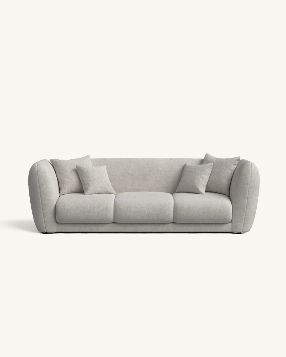 Entdecken Sie das Sofa Jill, ein Modell mit abgerundeten Linien, inspiriert von der Bold-Ästhetik. Mit 230 cm Breite bietet es ausreichend Platz für drei oder sogar vier Personen. Seine massive Holzstruktur sorgt für Stabilität und Langlebigkeit.