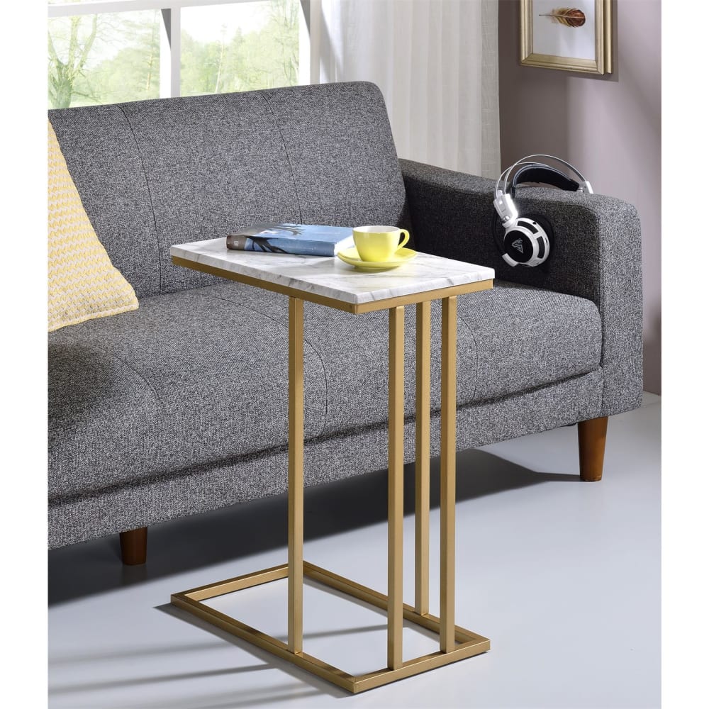 – Die Tischplatte ist aus MDF in gefertigt und mit einem Dekor in Marmor weiß foliert. Das rechteckige Fußgestell aus Metall ist golden lackiert.