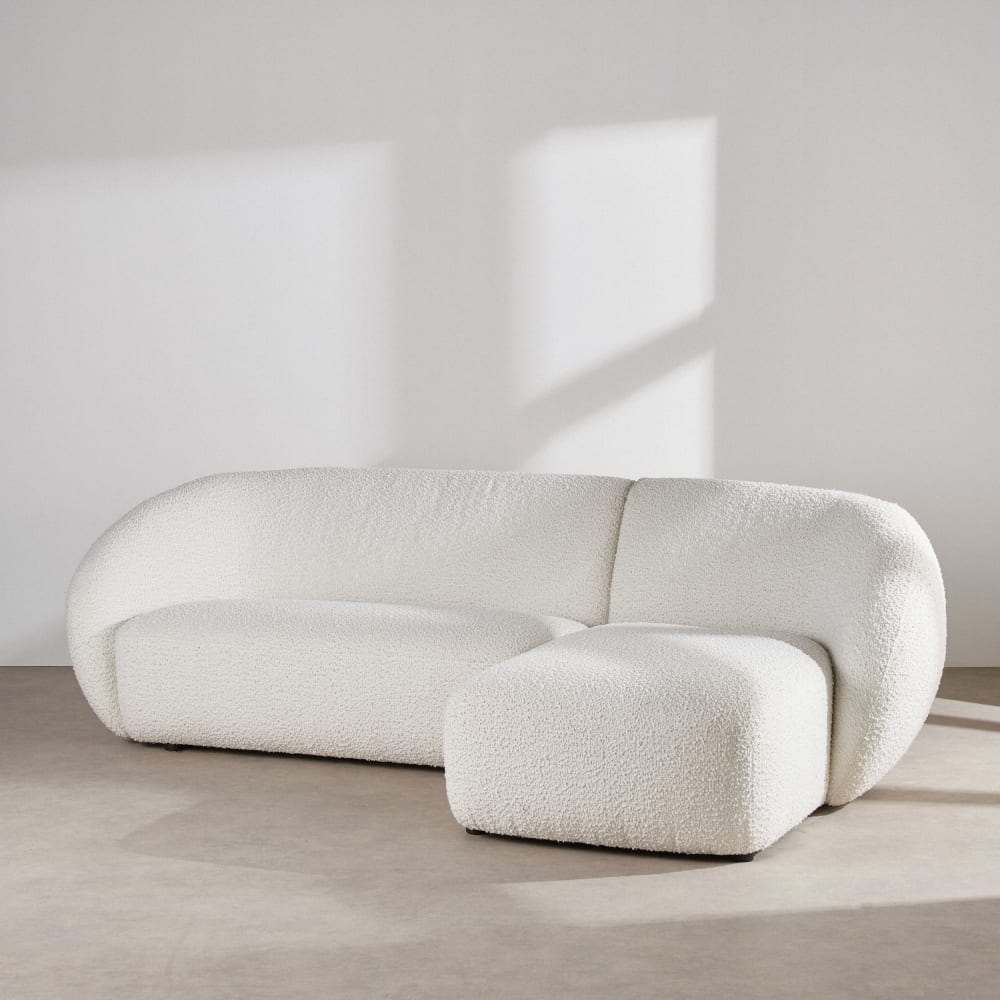 Das Ecksofa MALLOW (4/5-Sitzer, rechts) in ecrufarbenem Bouclé-Stoff bietet optimalen Komfort und einen schicken, modernen Stil. Dank des ecrufarbenen Bouclé-Stoffs liegt der Bezug voll im Trend. Die rechte Ecke verleiht Ihrem Wohnzimmer Struktur. Das Gestell aus massivem Kiefernholz und Sperrholz sorgt für Stabilität und Langlebigkeit. Die elastische Gurtfederung bietet optimalen Sitzkomfort.