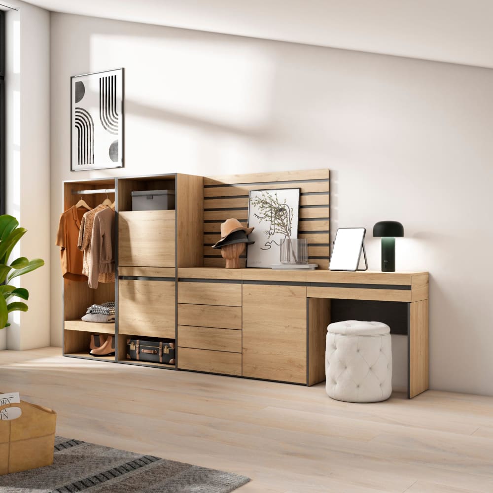 Kleiderschrank offen mit Regalen und Kleiderstange. Optimieren Sie den Platz mit diesem türlosen Kleiderschrank, der praktischen und funktionalen Stauraum für Ihre Kleidung, Schuhe und Accessoires bietet. Moderner Stil, elegant. Abmessungen: 60 x 35 x 145 cm (länge x breite x höhe). Eiche und Schwarz farbe mit poröser Touch-Holzmaserung.