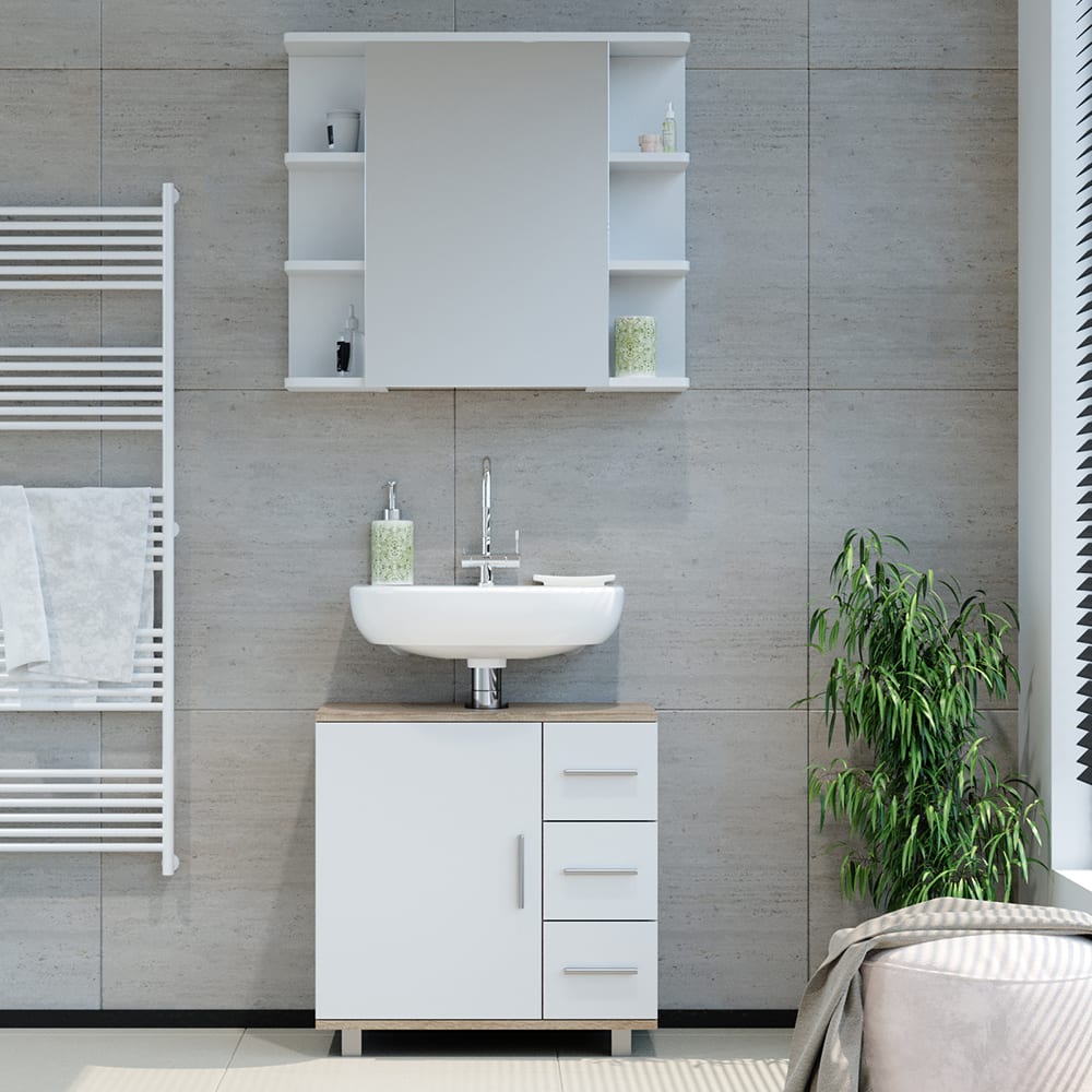 Entdecken Sie das Ilias Badmöbel Set, welches aus zwei praktischen Einrichtungsgegenständen besteht: einem Waschbeckenunterschrank und einem Spiegelschrank. Dieses funktionelle Design wird Ihnen viel Freude bereiten, denn es bietet reichlich Stauraum für all Ihre Badezimmerutensilien. Zudem können Sie verschiedene Sets der Serie kombinieren, um Ihre individuellen Bedürfnisse zu erfüllen. Obwohl die Füße an allen Einrichtungsgegenständen vorhanden sind, können Sie diese zusätzlich an der Wand befestigen, um eine noch bessere Stabilität zu gewährleisten. Sie möchten Ihr Badezimmer noch weiter aufpeppen? Kein Problem! Das Ilias-Sortiment bietet viele zusätzliche Artikel, die dieses Set perfekt ergänzen. Machen Sie Ihr Badezimmer zu einem Ort der Entspannung und des Wohlbefindens mit dem Ilias Badmöbel Set.—Technische Details:Farben:Sonoma, WeißMaterial:Spanplatte, 16 mmOberfläche:MelaminharzbeschichtungArtikelgewicht:35.42 kg.Artikelgewicht inkl. Verpackung:37.4 kg.—LIEFERUMFANG: Bad Spiegelschrank, Waschbeckenunterschrank, Montageanleitung, Montagematerial.