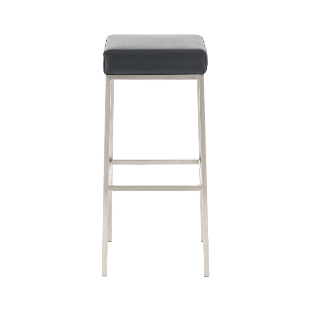 Die eckigen Sitze der Tresenstühle sind auch ohne Armlehnen und Rückenlehnen bequem. Dafür sorgt die Polsterung, die mit pflegeleichten und langlebigen Kunstlederbezügen versehen ist.