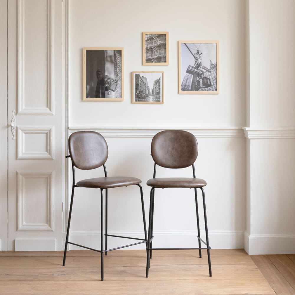 Die EDMOND-Barhocker haben einen Bezug aus Kunstleder und eine Schaumstoffpolsterung für optimalen Komfort. Ihre Eisenfüße sorgen für Stabilität und Festigkeit. Eine Fußstütze ist ebenfalls integriert, um den Beinen Komfort zu bieten. Dank ihres schlichten Designs lassen sich diese Hocker leicht in verschiedene Einrichtungsstile integrieren. Der Kontrast zwischen dem Bezug und den schwarzen Beinen wird Ihrem Raum einen Hauch von diskreter Eleganz verleihen! Details: Abmessungen: Hocker: T 51 × B 45 × H 98cm, Sitzfläche: D 41 × B 43 × H 67cm, Rückenlehne: Ép 3 X H 35cm, Fuß: Ø 1,6cm . Materialien : Beschichtung: Polyurethan, Polsterung: Schaumstoff 27kg/m³., Füße: Eisen . Farben : Bezug: braun, Füße: Schwarz . Zusätzliche Informationen : Nutzung: Innenbereich, Anzahl der Sitzplätze: 2, Maximal unterstütztes Gewicht: 120kg, Nettogewicht pro Einheit: 6kg, Fußstützen: ja, Zum Zusammenbauen (inkl. Anleitung).