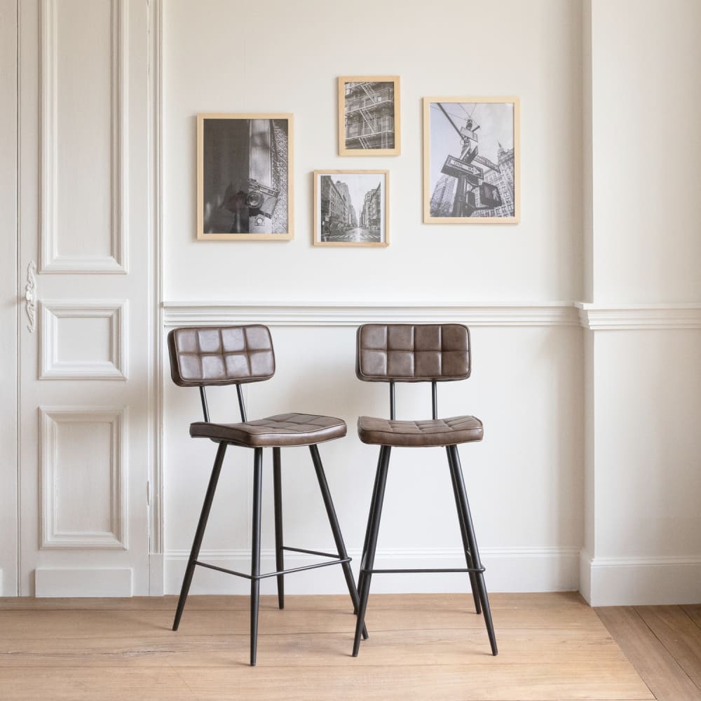 Die Barhocker FERNAND eignen sich perfekt für eine einladende und gesellige Einrichtung. Ihr Bezug weist ein gestepptes Muster auf, das eine Textur schafft, die sowohl ästhetisch als auch bequem ist. Diese Eigenschaft verleiht Ihrem Küchen, oder Barbereich einen weichen Touch. Die Schaumstoffpolsterung sorgt für gemütliche Abende mit Freunden. Die robusten Eisenfüße sorgen für eine hohe Stabilität. Die integrierte Fußstütze bietet zusätzlichen Komfort. Diese Hocker sind ideal für den Gebrauch im Innenbereich und fügen sich mit ihrem schlichten und eleganten Design problemlos in Ihre Einrichtung ein! Details: Abmessungen: Hocker: T 56 × B 43 × H 95cm, Sitzfläche: D 36 × B 37 × H 67cm, Rückenlehne: Ép 5 X H 31cm, Fuß: Ø 2,5cm . Materialien : Beschichtung: Polyurethan, Polsterung: Schaumstoff 27kg/m³., Füße: Eisen . Farben : Bezug: braun, Füße: Schwarz . Zusätzliche Informationen : Nutzung: Innenbereich, Anzahl der Sitzplätze: 2, Maximal unterstütztes Gewicht: 120kg, Nettogewicht pro Einheit: 7kg, Fußstützen: ja, Zum Zusammenbauen (inkl. Anleitung).