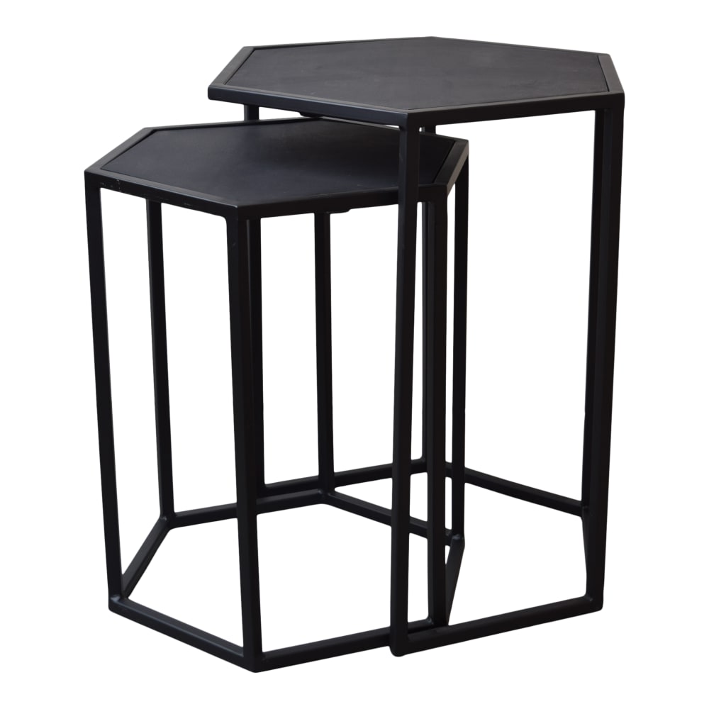 Multifunktional, dieses Set aus 2 Couchtischen! In der Tat können Sie die Tische zusammen als Couchtische verwenden, aber auch separat als Beistelltisch. Dieses Set von Loft42 Hexagon Couchtischen besteht aus zwei Couchtischen aus schwarzem Stahl kombiniert mit einer Platte aus schwarzem Mangoholz. Die Tische lassen sich perfekt zusammenschieben. Dieses Set ist ideal, wenn Sie zum Beispiel wenig Platz in Ihrer Wohnung haben.
