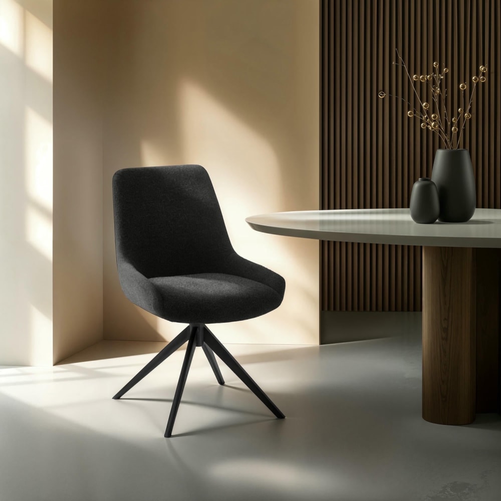 Dank der 360°-Drehfunktion & automatischem Zurückdrehen bleibt der Stuhl immer perfekt ausgerichtet eine praktische Lösung für den Essbereich oder den Arbeitsbereich. Das stabile schwarze Metallgestell verleiht dem Stuhl eine moderne Optik und hohe Stabilität.