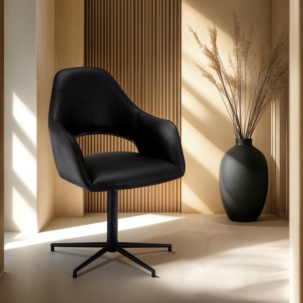 Dank des 360°-Drehmechanismus bleiben Sie flexibel und beweglich ideal für den Essbereich, das Homeoffice oder moderne Arbeitsplätze. Das robuste Metallgestell in Schwarz sorgt für Stabilität und eine stilvolle Optik.