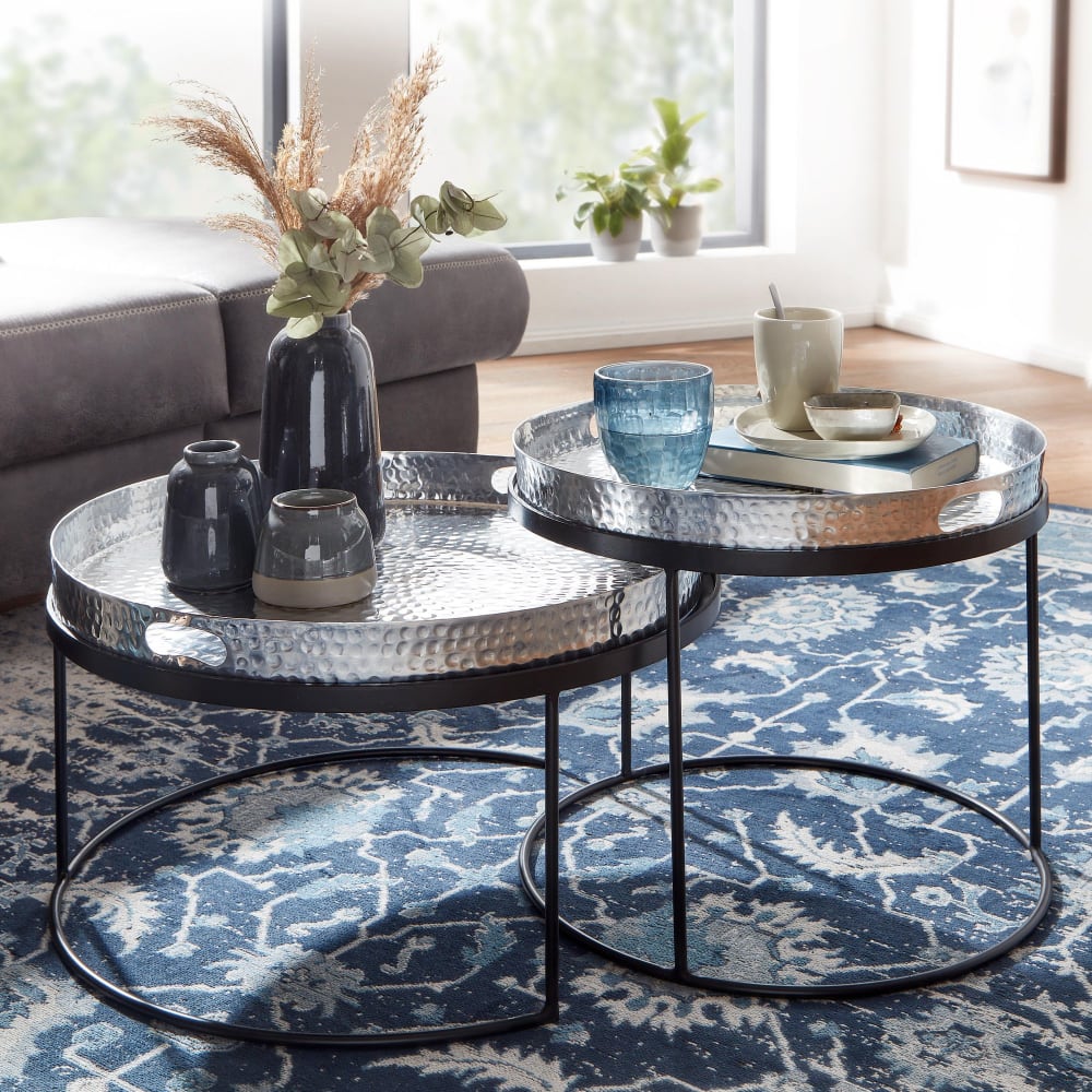 Satztisch mit kleiner ÜberraschungSo ein Tischset hat es in sich. Es schafft zusätzlichen Platz für die Dinge des Alltags oder für die Tasse Kaffee des Gastes. Das schicke Exemplar von FineBuy aber kann noch mehr. Seine Tischplatten lassen sich als Tablett verwenden, sodass Du beschmutztes Geschirr auf einen Schlag in Deine Küche tragen kannst. Die Optik der Tischchen ist hinreißend, das Material stabil. Ein perfekter Begleiter also für Dein Zuhause.Eine AugenweideFunktionell bieten Dir die Couchtische eine Menge. Neben der praktischen Nutzung als Tablett kannst Du sie unkompliziert von einem Raum in den anderen transportieren. Du stellst sie dort auf, wo sie im Moment benötigt werden. Das Beingestell besteht aus robustem Stahl. In tiefes Schwarz getunkt verleiht es den Möbelstücken einen festen Stand. Die Tischplatten lenken die Blicke durch eine Hammerschlag Struktur auf sich. Für die Tablettfunktion fügten die Hersteller praktische Griffmulden ein. Wähle zwischen einem funkelnden Silberton oder einem warmen Gold Deinen Favoriten.Die Wohnzimmertische sind in reiner Handarbeit gefertigt, sodass Du sicher sein kannst, mit jedem Exemplar ein echtes Unikat zu erwerben. Mit diesem Wissen bringt dir der Erwerb noch mehr Spaß. Denn Möbel von der Stange gibt es in den Kaufhäusern genug. Tu Dir was Gutes und greife nach dem Individuellen!