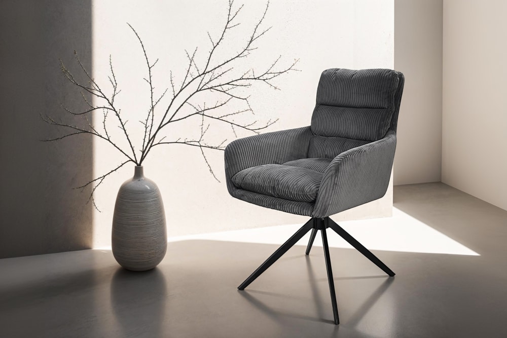 Elegantes Design: Der hochwertige Grob-Cord Bezug in dunkelgrau mit dekorativer Ziernaht verleiht dem Stuhl eine zeitlose Optik.