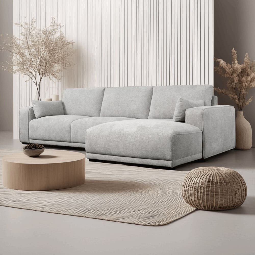 Das California L-Shape Sofa ist die perfekte Kombination aus modernen Linien und gemütlichem Komfort. Mit seiner großzügigen Sitzfläche, der hochwertigen Federkernpolsterung und dem robusten Stoffbezug (Martindale 45.000) ist es ein echtes Highlight in jedem Wohnzimmer.