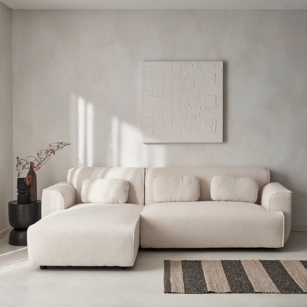 Die ProduktvorteileCremefarbener Bouclé-BezugMitgelieferte Kissen mit abziehbarem BezugEinfacher AufbauDieses Sofa mit weißem Bouclé-Bezug verleiht einer klassischen Dekoration einen originellen Touch. Er wird mit drei kleinen rechteckigen Kissen geliefert, die einen abnehmbaren Bezug haben, und Sie können ein Plaid für noch mehr Stil hinzufügen. Gönnen Sie sich dank des weichen Stoffes und der raffinierten Linien ein minimalistisches und kuscheliges Wohnzimmer!Achtung, einige Elemente des Sofas können für den Transport in den Sitzflächen verstaut werden.Tipps zur PflegeNicht waschen. Bleichen ist nicht erlaubt. Nicht im Wäschetrockner trocknen. Nicht bügeln. Keine chemische Reinigung.EigenschaftenAnzahl der Recamieren: 1Recamiere beidseitig verwendbar: NeinSchlaffunktion: NeinWird mit drei rechteckigen Kissen geliefert (Bezug abnehmbar)Dichte: 370 g/m².Material: PolyesterMontage: Die Füße sind für den Transport abmontiert. Sie müssen sie nur noch mithilfe des mitgelieferten Werkzeugs anbringen, damit Sie so schnell wie möglich von Ihrem Sofa profitieren können!Anzahl der Sitzplätze: 3Füße : Schwarzes PVCGarantie: 2 JahreMaterial des Gestells : PappelholzKissen: 100% PolyesterAbmessungenSofa: B 196 x T 151 / 91 / x H 73cm (mit / ohne Recamiere)Sitzfläche: B 196 x T 64cmHöhe der Sitzfläche: 40,5cmRückenlehne: B 196 x H 41,5cmBreite der Armlehne: 33cmRecamiere: B 73,5 x T 126cmMax. Belastung: 110kg / Platz