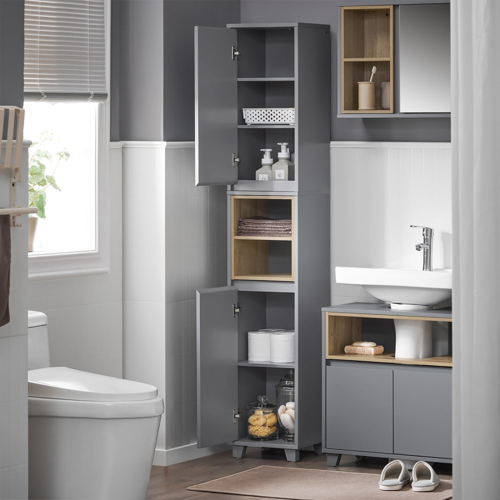 Dieser Badezimmer-Hochschrank hat eine kleine Grundfläche für kleinere Badezimmer, so dass Sie sich keine Sorgen machen müssen, dass Ihnen der Platz ausgeht.