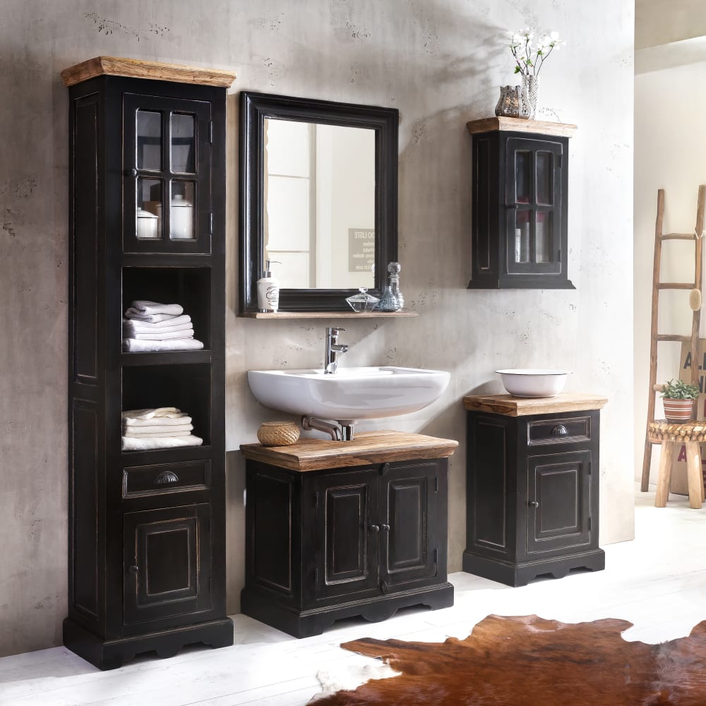 Ein Badezimmerschrank der keine Wünsche offen lässt. Hinter einer mit Holzsprossen versehenen Glastür verbirgt sich der erste Stauraum für Kosmetika und vielerlei Accessoires. Es folgen 2 offene Regalfächer für Badetücher, Handtücher, quasi der Wäscheschrank im Badschrank. Der Schubkasten hat Platz für private Dinge und wurde mit einem Griff in Muschelform aus Metall verziert. Die darunter liegende blickdichte Tür ist wie der komplette Hochschrank, mit Ausnahme der honigfarbenen Deckplatte, aus schwarzem Mango-Holz. Mit modernen Badmöbeln ist dieser Mehrzweckschrank problemlos kombinierbar. Als einzeln stehender Schrank verliert er ganz sicher auch nicht seinen Reiz.