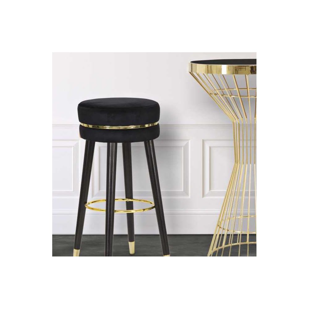 Runder Barhocker aus gepolstertem schwarzem Stoff mit schwarzen Holzbeinen und goldenen Dekorationen. Komplett mit praktischem Fußring aus goldenem Metall. Abmessungen Ø cm 35×74. Gewicht unterstützt 120 kg. Produkt zu montieren. Zur Reinigung ein feuchtes Tuch oder Dampf verwenden.