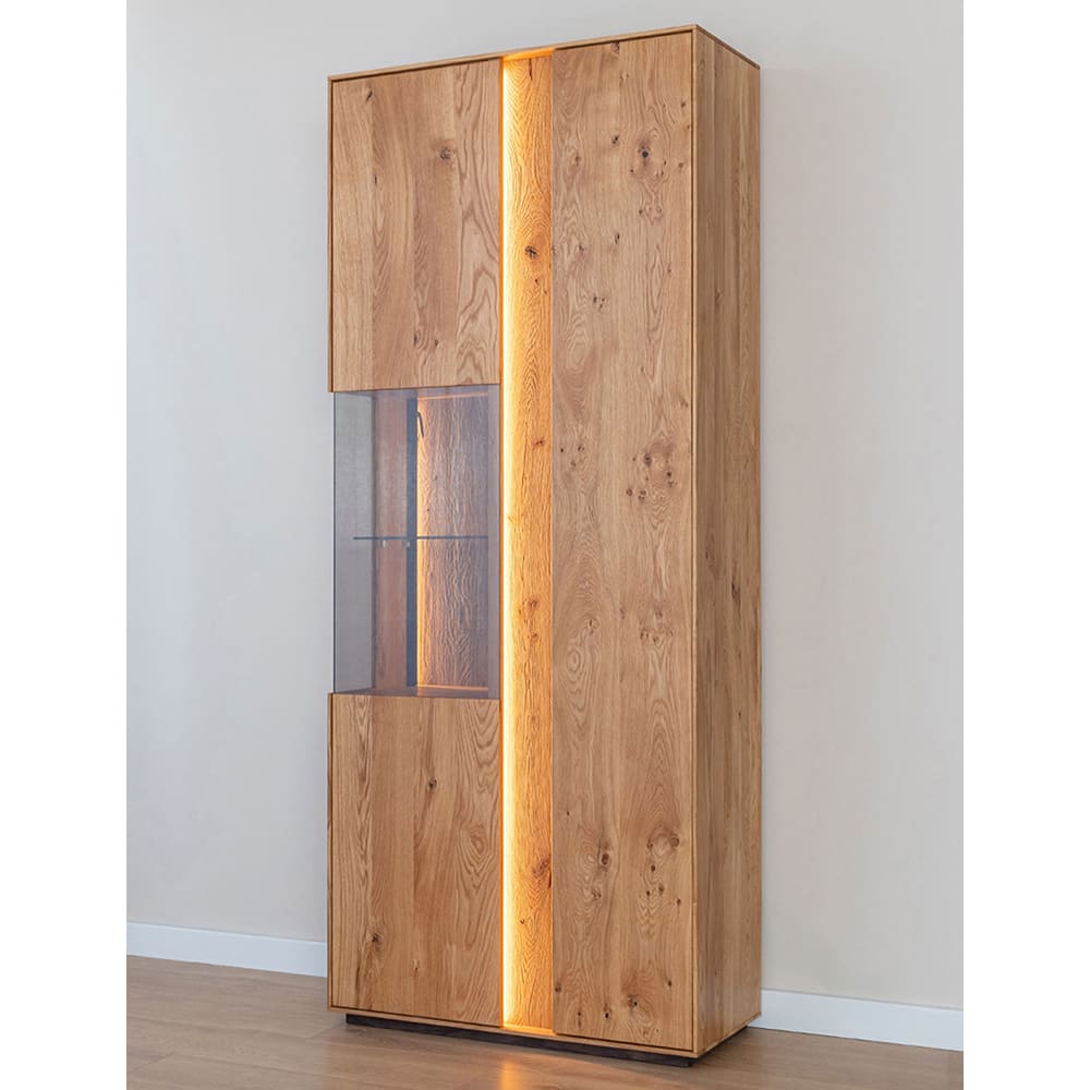 Ausstattung / Abmessungen (ca. Maße): – natürliches Massivholz, geölt- einzigartige Holzmaserung- 2 Türen, innen 1 Glasboden & 8 Holzböden- mit Push to open Funktion- Tür mit Glaseinsatz- getöntes Glas- mit Beleuchtung- B/T/H: 84,5cm / 37cm / 205cmRechtlicher Hinweistext:WEEE-Registrierungsnummer für Beleuchtungen, die in dem Artikel enthalten sind: Furnika 79775006