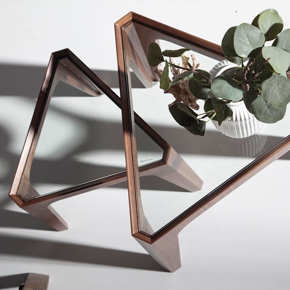 Dreieckiger Ecktisch aus gehärtetem Glas und Nussbaum modell 2107 Angel Cerdá S.L.Dreieckiger Ecktisch in modernem Design mit Platte aus gehärtetem Glas und originellen Holzbeinen, die mit natürlichem Nussbaum furniert sind. Ein Stück mit einem einfachen, aber originellen Design, das eine einzigartige und persönliche Note verleiht.Abmessungen des Produkts: 45 x 39 x 42 cm.- Die Platte dieses Beistelltischs aus gehärtetem Glas bringt Licht und Leichtigkeit in den Raum und macht ihn zu einem wichtigen Teil der Dekoration Ihres Wohnzimmers. – Die elegante Struktur der Beine aus nussbaumfurniertem Holz mit einer Stärke von 0,5 mm eignet sich perfekt für die Schaffung eines modernen und stilvollen Ambientes. – Sowohl durch sein Design als auch durch seinen modernen Stil wird er es Ihnen ermöglichen, eine Atmosphäre voller Avantgarde und Raffinesse zu schaffen. – Vielseitig und funktionell, passt er in jede Umgebung und wird zu einem Schlüsselelement in der Dekoration Ihrer Wohnung.