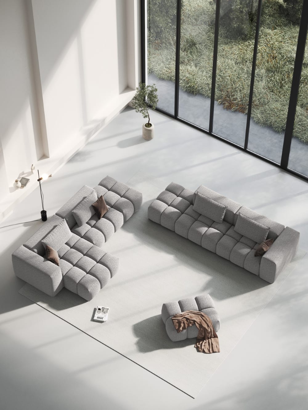 Sorella ist ein strukturierter Polsterstoff, der durch sein interessantes und eindrucksvolles Aussehen besticht. Er zeichnet sich durch ein feines Tweed-Gewebe mit einem klar erkennbaren, regelmäßigen Muster aus. Das Material fühlt sich sehr glatt an, wobei ein zarter Flaum auf der Oberfläche ein angenehmes Gefühl von Weichheit und behaglicher Wärme vermittelt. Inspiriert von der Retro-Ästhetik, verleiht es den Möbeln einen besonderen Charakter von ausgewogenem Luxus. Die Stoffoberfläche ist leicht glänzend, und seine nicht einheitliche, melierte Farbgestaltung fasziniert und zieht Blicke auf sich. Dies bestätigt, dass traditionelle Designansätze in zeitgenössischen Interieurs frisch wirken können. Sorella eignet sich hervorragend für die Polsterung klassischer Möbelstücke, aber auch für große Sofas mit minimalistischen Silhouetten oder abgerundeten Formen. Es neigt dazu, Arrangements im Stil feinster Eleganz zu kreieren. Gleichzeitig besitzt der Stoff praktische Eigenschaften, die den alltäglichen Gebrauch der Möbel signifikant verbessern. Er ist widerstandsfähig gegen Verschleiß, fleckenresistent und einfach zu reinigen. Flecken auf der melierten Oberfläche fallen weniger auf, was es ermöglicht, die Schönheit der Möbel länger zu genießen.