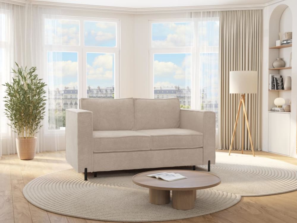 Verleihen Sie Ihrem Wohnzimmer mit dem Schlafsofa ELORYA mit Matratze einen Hauch von moderner Eleganz – die perfekte Kombination aus Design, Komfort und Cleverness. Der Bezug aus Strukturstoff ist warm und strapazierfähig und verleiht Ihrem Wohnzimmer einen Hauch von Charakter. Verwandeln Sie Ihr Sofa dank des Mechanismus mit Matratze im Handumdrehen in ein geräumiges Bett. Sie müssen keine Kissen weglegen, Aufwand gleich null, ideal für eine tägliche Schlafgelegenheit oder um spontan Gäste zu empfangen.Produktdetails Technologie (Raumgewicht): 28 kg/m³ Farbe (Schattierungen): Beige Material: 100 % Polyester Struktur: Holz, MDF, Metall Finish: Strukturiert Anzahl Personen: 4 Personen Polsterung Sitzfläche: atmungsaktiver Polyurethanschaum Raumgewicht der Sitzfläche: 30 kg/m³ Unterfederung der Sitzfläche: Elastische Polstergurte Polsterung der Rückenlehne: Polyurethanflocken Mit Armlehnen Art der Bettfunktion: Express-Bettfunktion Regelmäßiger Schlafgebrauch Mit Lattenrost Lattenrost: Metall Produktserie: Good for Planet Ökologische Kriterien: Hergestellt in Europa Maximale Traglast: 480 kg Produkt zum SelbstaufbauCa.-Maße Breite: 218 cm Höhe: 100 cm Tiefe: 223 cm, 95 cm Matratzenstärke (cm): 20 cm Höhe der Füße: 2.5 cm Sitzhöhe: 56 cm Sitztiefe: 56 cm Breite Liegefläche: 160 cm Länge Liegefläche: 190 cmVersanddetailsLieferzeit und Versandkosten werden Ihnen auch in Ihrem Warenkorb angezeigt.Bitte überprüfen Sie bei der Annahme der Lieferung die Anzahl der Pakete.PaketPaket Nr.1: Breite 185 cm, Tiefe 97 cm, Höhe 90 cm, Gewicht 110 kg, Paket Nr.2: Breite 87 cm, Tiefe 70 cm, Höhe 40 cm, Gewicht 30 kg,