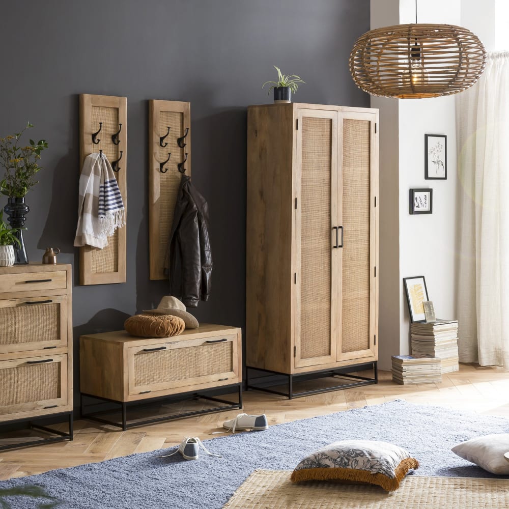 Werten Sie Ihren Dielenbereich mit diesem Schrank aus naturfarbigem Mangoholz mit luftiger Rattan-Front und einem Kufengestell aus schwarzem Metall auf. Der Schrank ist dank seiner Kombinationsmöglichkeit mit schon vorhandenem Mobiliar vielseitig einsetzbar, so ist er gerade für den angesagten Industrial Look wie gemacht, aber auch mit Landhausmöbeln oder skandinavischem Design lässt er sich problemlos kombinieren. Der Kleiderschrank kann wahlweise mit 3 Einlegeböden oder 1 Einlegeboden und 1 Kleiderstange genutzt werden. Durch seine Optik mit dem modernen Materialmix sorgt der Schuhschrank für eine wohnliche Atmosphäre in Ihrem Zuhause.