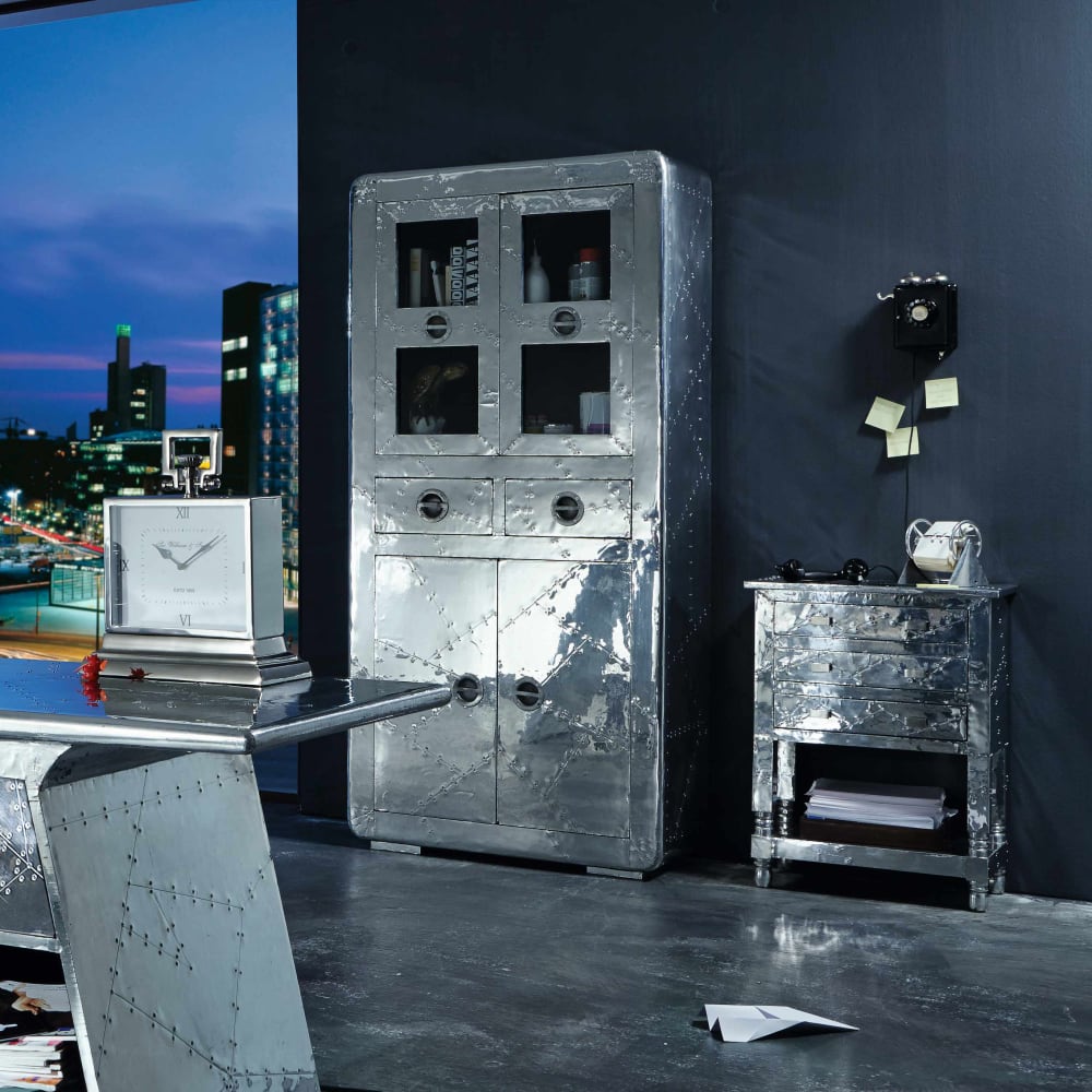 Freunde von Science Fiction Streifen aus den 60er Jahren kommen bei dieser Vitrine voll auf ihre Kosten. Das Möbelstück im außergewöhnlichen Alu-Look erinnert dank der integrierten Zierschrauben an futuristische Flugzeugbauten. Die komplett verspiegelte Oberfläche der Vitrine ist ein absoluter Hingucker im Factory Design und sorgt dafür, dass der Raum, in dem sie einzieht, größer wirkt. Die Vitrine bietet mit zwei Türen, zwei Schubladen und vier offenen Fächern mit Türen jede Menge offenen und geschlossenen Stauraum. Im Esszimmer finden so zum Beispiel Geschirr, Schalen und Platzsets in den geschlossenen Fächern und Schubladen Platz, Gläser können staubgeschützt hinter den Türen mit Sichtfenstern in Szene gesetzt werden. Die Vitrine kann selbstverständlich auch in Wohnzimmer oder Arbeitszimmer eingesetzt werden, der Fantasie sind bei dem Einsatz dieses besonderen Stückes keine Grenzen gesetzt.
