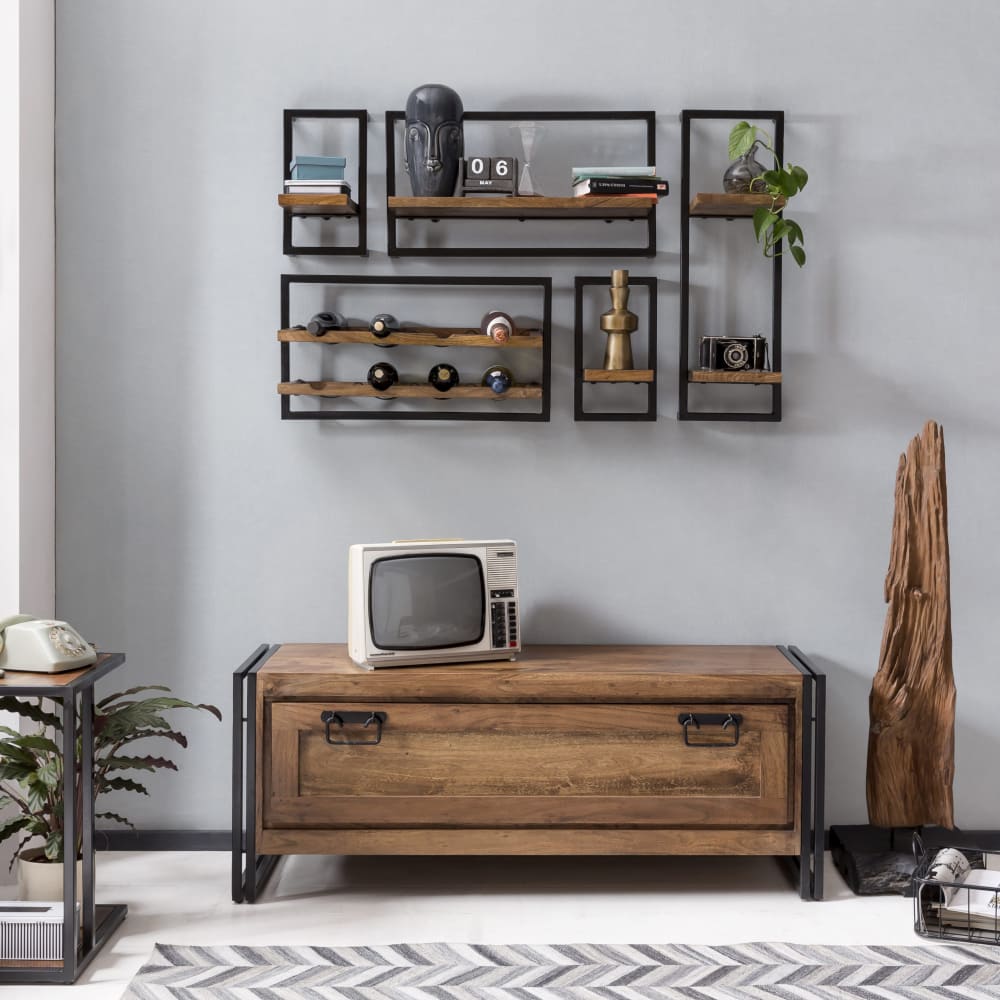 Massives Akazienholz trifft auf industrielles Design. In dem Schuhschrank verbirgt sich ausreichend Platz für Sportschuhe, Sandalen, Slipper, Sneaker, Kinderschuhe usw. Der Garderobenschrank ist sehr stabil. Die Deckplatte der Dielenkommode lädt zum Dekorieren ein, kann aber auch kurzfristig als Sitzbank dienen, um das Schuhe anziehen zu erleichtern. Durch die in schwarz aufgeführten Metallteile ergibt sich ein reizvoller Kontrast. Ob als Einzelschrank oder kombiniert mit weiteren Garderobenmöbeln, diese Schuhkommode ist vielseitig integrierbar. Auch mit einem darüber angebrachten Spiegel oder immer wieder neu dekoriert, ist der Schuhkipper in Flur und Diele ein Eyecatcher.