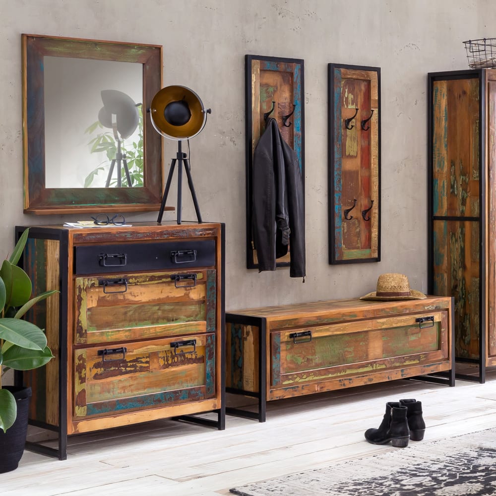Dieser Schuhschrank, angefertigt aus altem, massivem Holz von Fischerbooten, sorgt für Ordnung im Leben Ihrer Schuhe. Die mit 2 Metallgriffen versehene Klappe lässt sich auch von Kindern einfach öffnen, welche die Schuhkommode auch gerne als Sitzbank während des Anziehens der Schuhe nutzen können. Das schwarze Gestell, ebenfalls aus Metall, wurde bewusst auf alt getrimmt, um das beliebte factory Design zu kreieren. Wird die Dielenkommode nicht als Sitzmöglichkeit genutzt, lässt sich die Deckplatte sich auch wunderbar dekorieren. Hinter der Klapptür findet sich auf 2 Ebenen genügend Raum für Sportschuhe, Sandalen, Slipper, Sneaker, Kinderschuhe usw. In jeder Diele und jedem Flur kommt der Vintage-Look besonders zur Geltung.