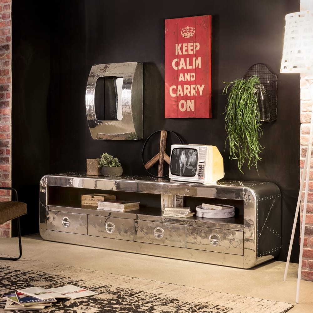 Das geräumige Lowboard im modernen Industrial Design bietet jede Menge Platz für TVs bis zu einer Größe von 70“. In dem offenen Fach finden weitere HiFi-Geräte Platz: Fernbedienungen, lose Kabel und weitere Kleinigkeiten lassen sich problemlos in einer der vier Schubladen verstauen. Die komplett mit Alu beschlagene Oberfläche des Boards geben dem Möbel einen coolen Spiegel-Look, welcher den Raum größer und heller wirken lässt. Die Metalloptik mit Zierschrauben erinnert an futuristische Flugzeugbauten oder modernste Fabrikgebäude. Das Lowboard verkörpert den angesagten Industrial Style durch und durch. Runde Metallbeschläge, inspiriert von schweren Tresortüren, bilden die Griffe der Schubladen. Scharniere und Schubladenführungen aus Metall sind optimal geeignet, um den Belastungen des Alltags Stand zu halten. Das Lowboard passt als origineller Kontrast in schlichte Einrichtungen oder aber harmoniert mit weiteren Möbeln der Serie in Flugzeug-Optik.