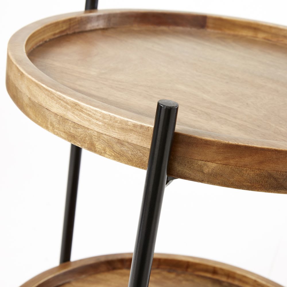 Der Beistelltisch aus Mangoholz und schwarzem Metall OREGON lässt Ihre Deko zur Geltung kommen und kann mit mehreren Einrichtungswelten kombiniert werden. Das schöne, praktische und gemütliche Möbelstück passt in ein industriell oder exotisch inspiriertes Wohnzimmer und fügt sich ganz einfach in Ihr Interieur ein. Das röhrenförmige schwarze Metallgestell passt auf eine ganz selbstverständliche Art und Weise zu den 2 Tischplatten aus Mangoholz und zaubert ein harmonisches Ensemble herbei, das garantiert Wirkung zeigt! Unser Dekotipp: um eine botanische Ecke zu erschaffen ergänzen Sie diesen Beistelltisch mit ein paar Pflanzen oder stellen Sie Ihre Lieblingsobjekte mit ein paar Zeitschriften darauf, um sie immer griffbereit zu haben.