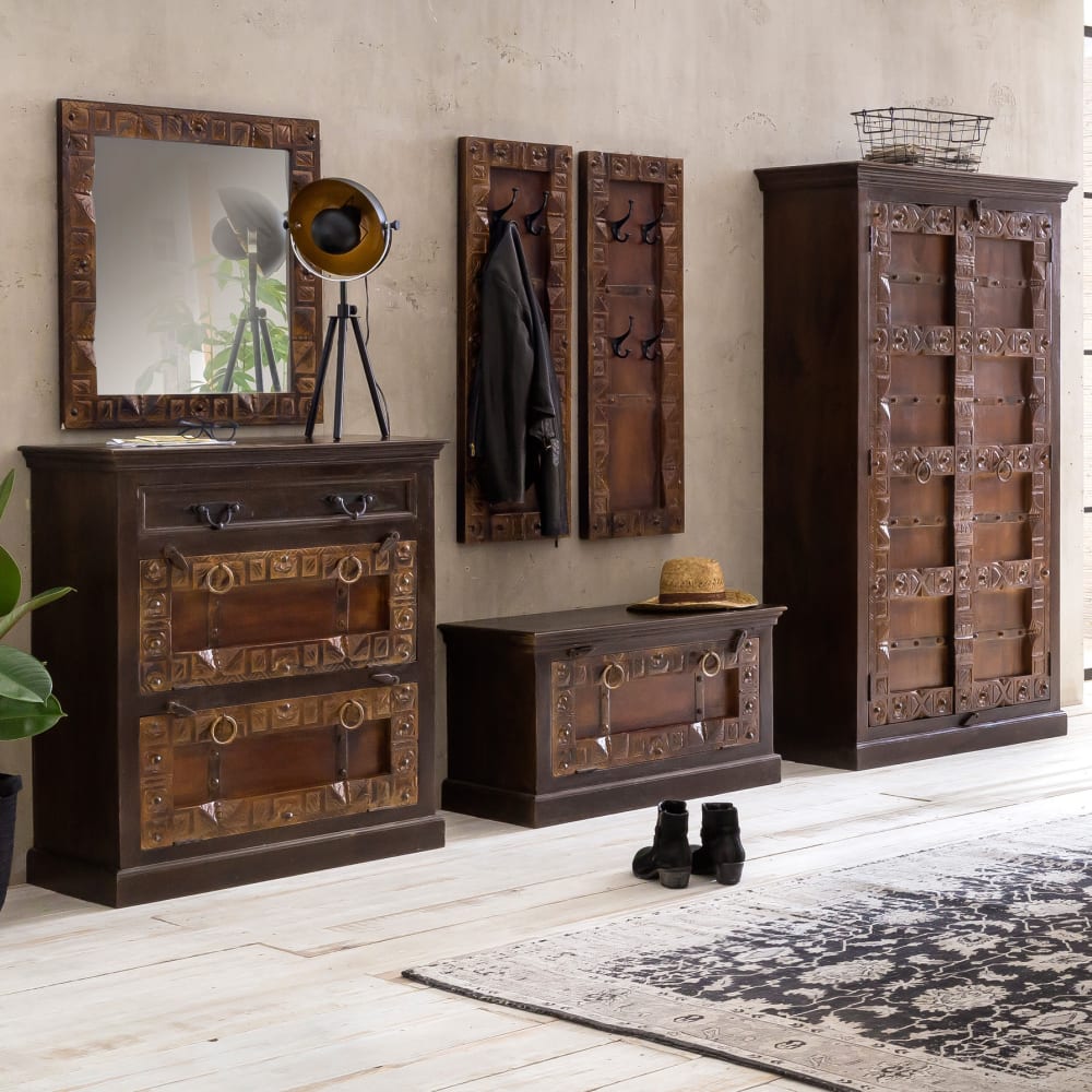 Dieser Schuhschrank, mit aufwändigen Schnitzereien auf recyceltem Altholz verziert, sorgt für Ordnung im Leben Ihrer Schuhe. Die mit 2 Ringriffen und mit Metallapplikationen versehene Klappe lässt sich auch von Kindern einfach öffnen, welche die Schuhkommode auch gerne als Sitzbank während des Anziehens der Schuhe nutzen können. Wird die Dielenkommode nicht als Sitzmöglichkeit genutzt, lässt sich die Deckplatte auch wunderbar dekorieren. Hinter der Klapptür findet sich auf 2 Ebenen genügend Raum für Sportschuhe, Sandalen, Slipper, Sneaker, Kinderschuhe usw. In jeder Diele und jedem Flur kommt der antik koloniale anmutende Charme ausdrücklich zur Geltung.