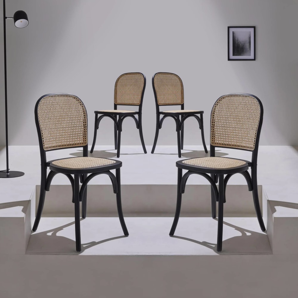 4er-Set Vintage-Stühle aus Holz und Rattan, schwarz von sweeek